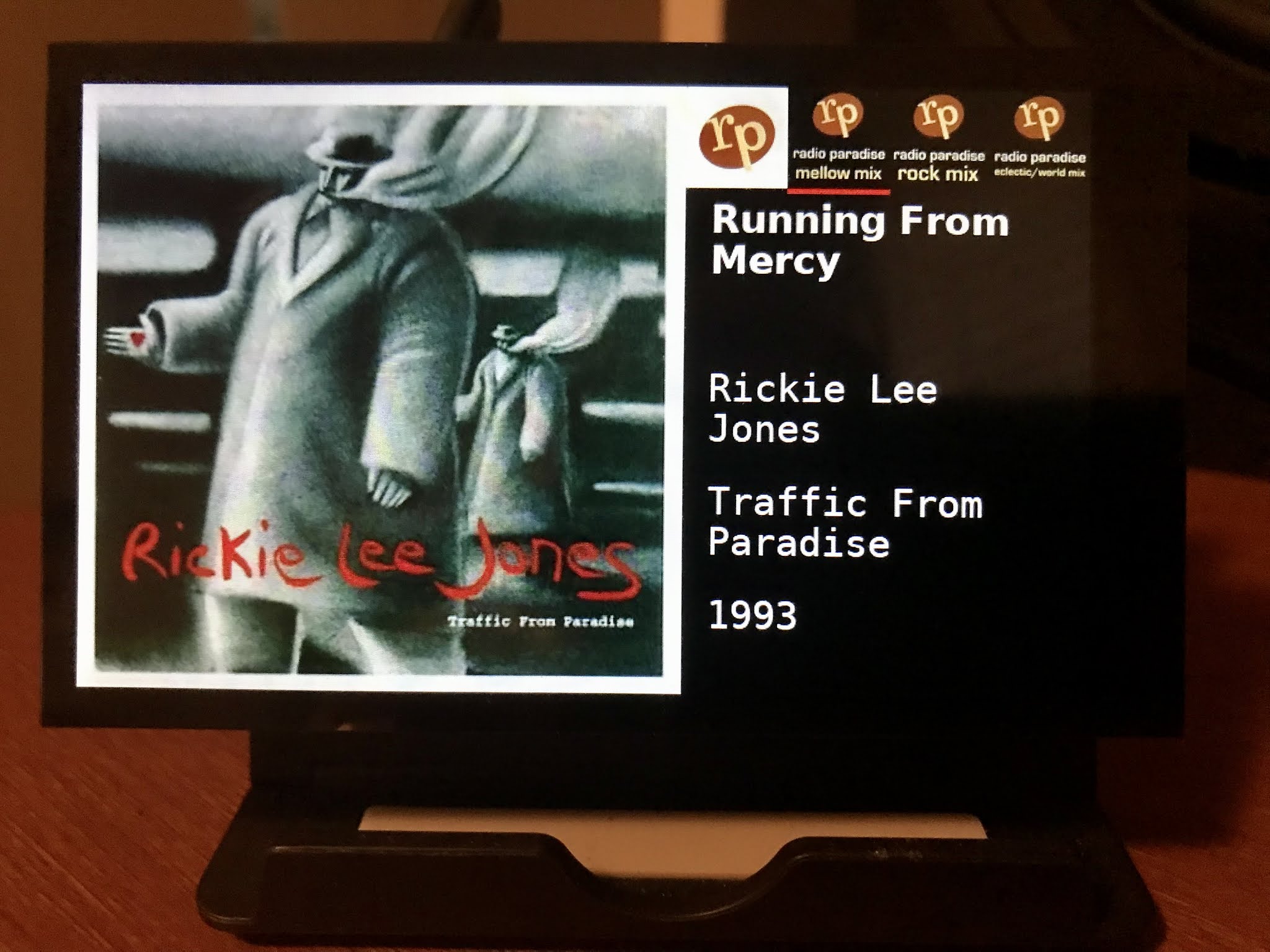 The good folks in charge of RP were good enough to provide a web service that returns all that metadata, and a link to the album art, for the "now playing" song on every channel. It's a matter of a Python script, with the requests and pillow modules, to download the metadata and album art, render it to an image, then use an app to push the image to the RPi's framebuffer. Oh, and python-evdev to get the touchscreen events to change stations...