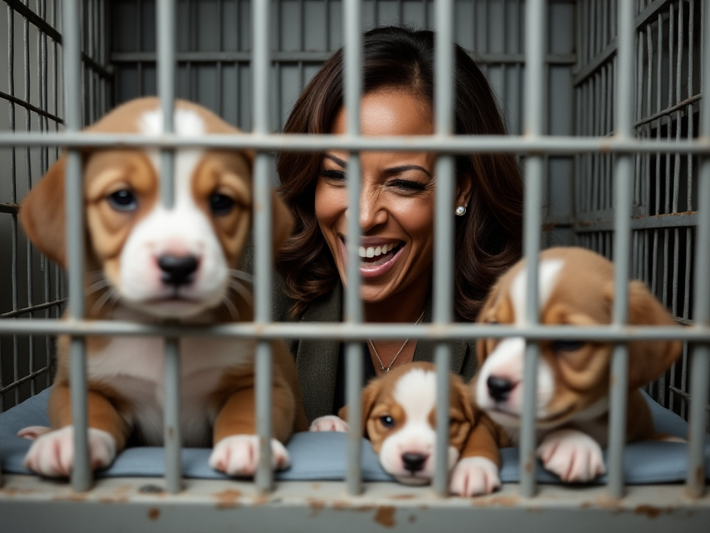 Here's a photo of Kamala harassing innocent puppies. Wait until you hear the obscenities she uttered about those puppies!