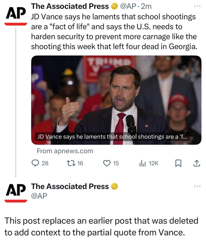 AP's job is to report the news. Factual news. AP's fake Vance quote did not carry a byline/author. AP's job is NOT to speculate, offer opinion, or interpret what someone said - unless their resulting article is clearly labelled as opinion. This news item from AP was not labeled as opinion. Again, they presented Vance's words as JD Vance says school shootings are a 'fact of life', (ie get used to it, citizens) ... The use of the symbol for single quote ( ' ) means a quote within a quote. And those words were no such thing.