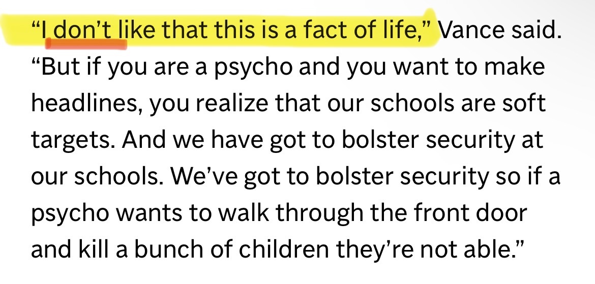 Yeah I don't know how to say this but you are missing the point. That a GOP candidate for high office admits that school shootings in America are a fact of life? THAT is the story. Everything else that he said or what you or I say about what else he said is not news. Vance: School shootings are a fact of life. He said it, that's the news. Context is irrelevant. We as a nation have never (to my knowledge) admitted this. This is in no way a condemnation of Vance, although I clearly have thoughts about what he said before and after.